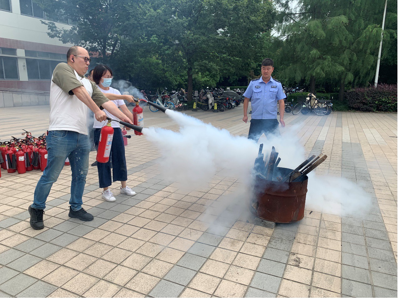 讲座结束后,谢鹏辉老师和平台工作人员带领师生们在A楼广场进行了消防演练活动。指导师生如何正确使用灭火器进行灭火,并组织各位老师和学生进行了灭火器灭火演练,师生们通过演练掌握了使用灭火器的方法,为校园安全增强了保障。