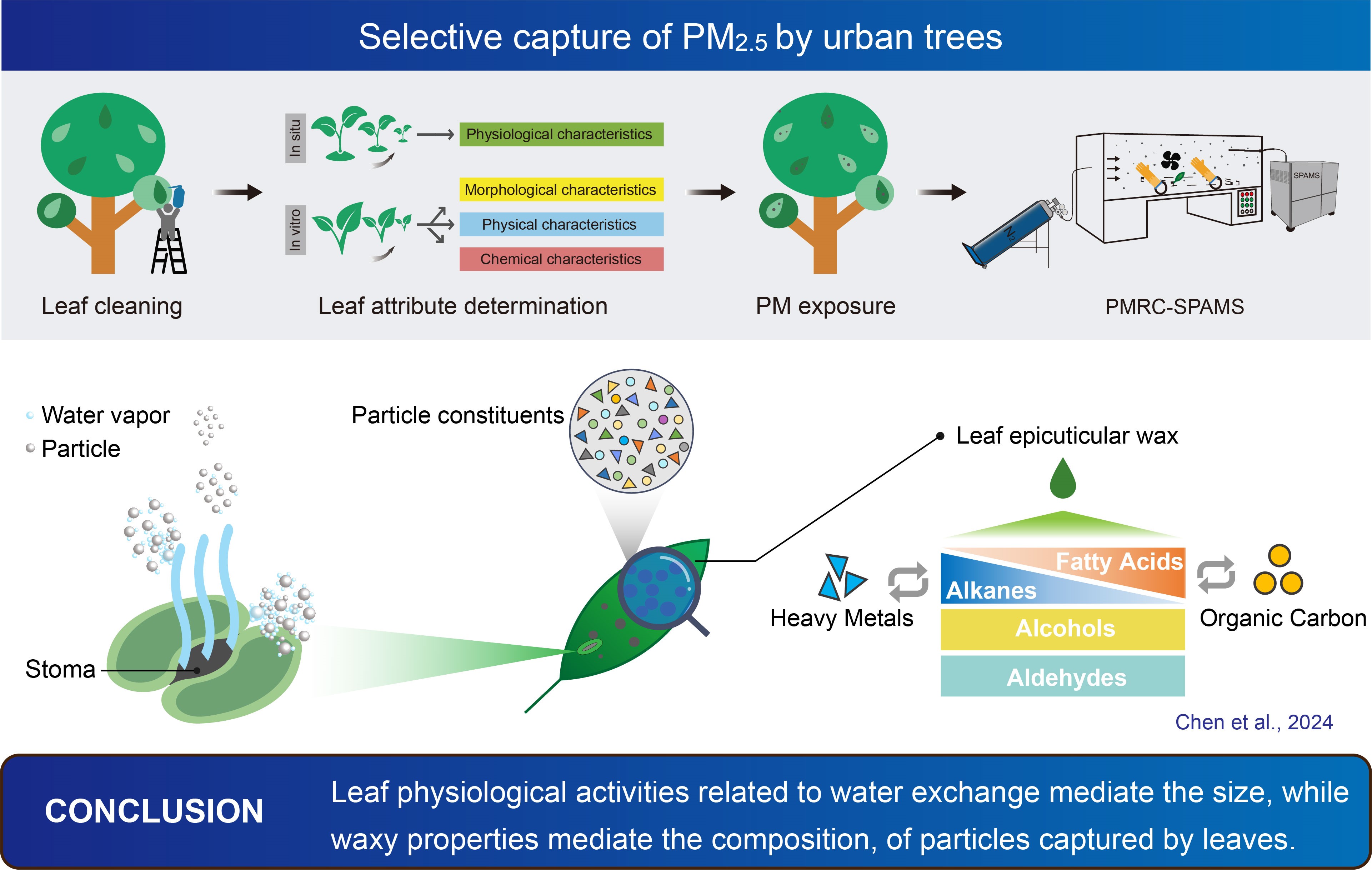 近日,304am永利集团官网殷杉教授课题组在Journal of Hazardous Materials期刊发表题为''Selective capture of PM2.5 by urban trees: The role of leaf wax composition and physiological traits in air quality enhancement''的研究论文。研究通过颗粒物悬浮技术及单颗粒气溶胶质谱技术,对比分析了城市典型绿化树种叶片表面滞留颗粒的粒径及化学组成,揭示了城市森林对大气颗粒物的选择性吸附机制。
